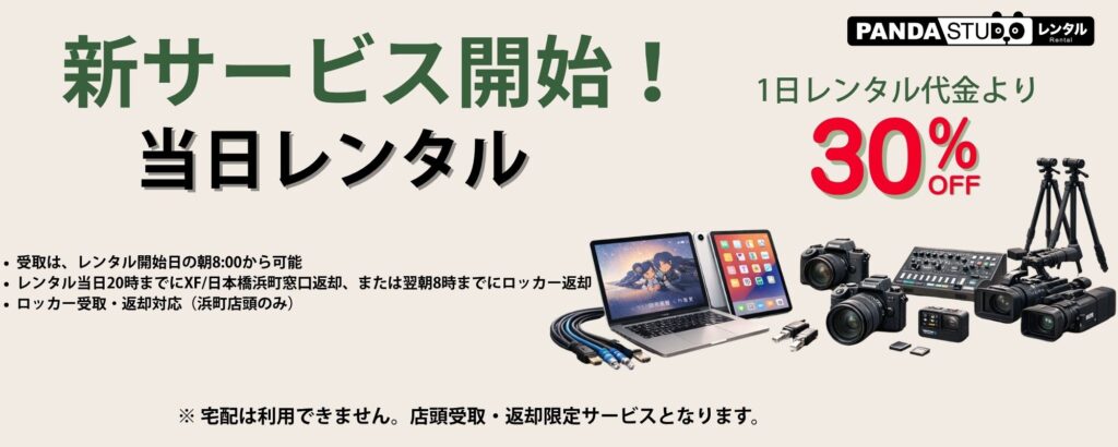 2026年3月3日より、パンダスタジオレンタルの新サービス「当日レンタル」がスタートしました。急な撮影やイベント、機材トラブルなど「今日すぐ借りたい」に対応する、店頭受取限定の特別プランです。当日レンタルとは、1日レンタル(開始日=終了日)のみが対象となります。ご注文時はカレンダーでご利用日を1回クリックするだけで、開始日・終了日が同日に自動設定されるため、スムーズにお手続きいただけます。